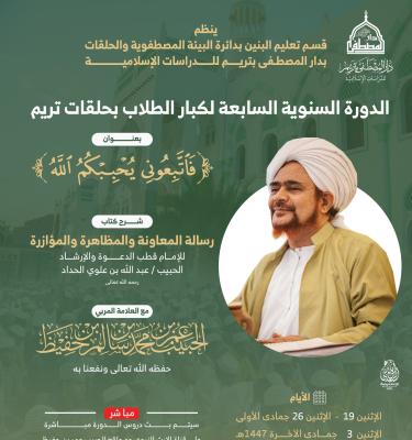 إعلان: فاتَّبِعوني يُحبِبْكُمُ الله الدورة السنوية السابعة لكبار الطلاب بحلقات التعليم بتريم عنوان الدورة: (فاتَّبِعوني يُحبِبْكُمُ الله) المقرر: شرح كتاب «رسالة المعاونة والمظاهرة والمؤازرة» للإمام...