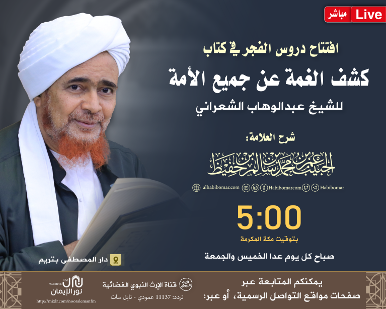 يفتتح العلامة الحبيب عمر بن محمد بن حفيظ صباح يوم الإثنين 11 شوال 1444هـ الموافق 1 مايو 2023م إن شاء الله تعالى ، القراءة في: