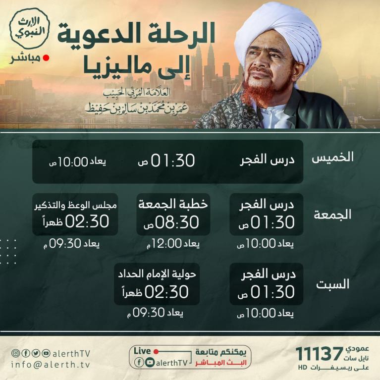 يمكنكم متابعة البث المباشر على قناة الإرث النبوي الفضائية، وعلى موقع الحبيب عمر وصفحات التواصل الاجتماعي