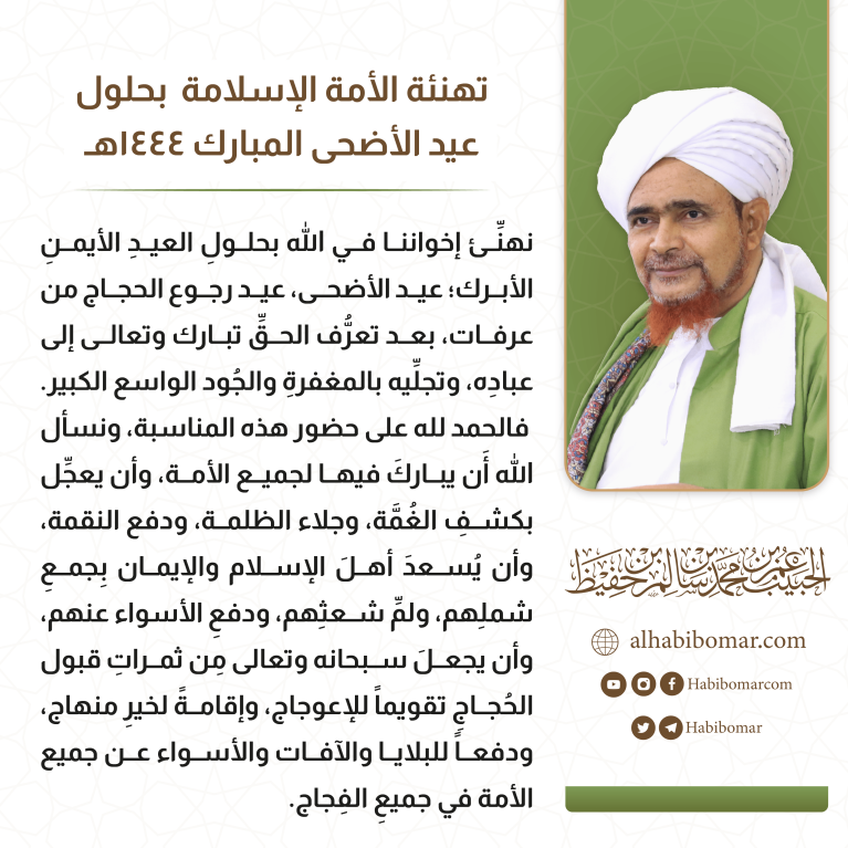 نهنِّئ إخواننا في الله بحلولِ العيدِ الأيمنِ الأبرك؛ عيد الأضحى، عيد رجوع الحجاج من عرفات، بعد تعرُّف الحقِّ تبارك وتعالى إلى عبادِه، وتجلِّيه بالمغفرةِ والجُود الواسع الكبير.