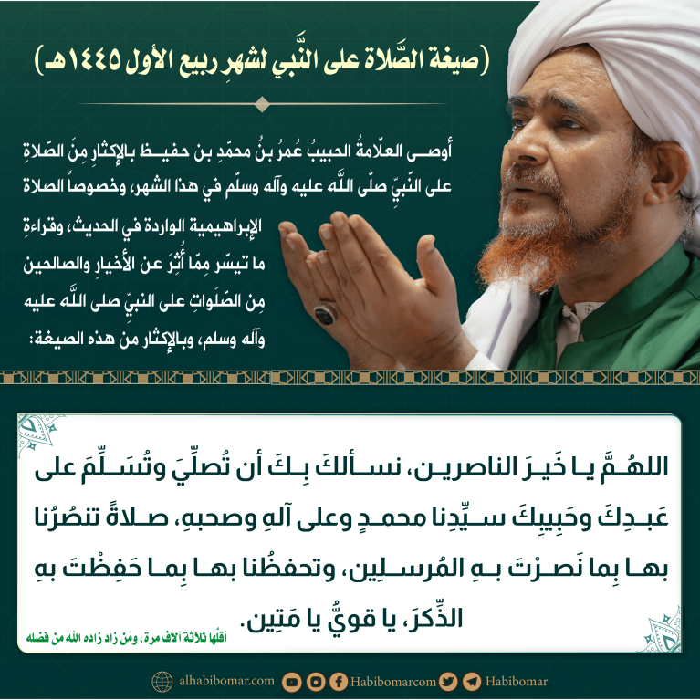 أوصى العلَّامةُ الحبيبُ عُمرُ بنُ محمَّدِ بن حفيظ بالإكثارِ مِنَ الصَّلاةِ على النَّبيِّ صلَّى الله عليه وآله وسلَّم في هذا الشهر، وخصوصاً الصلاة الإبراهيمية الواردة في الحديث، وقراءةِ ما تيسَّر مِمَّا أُثِرَ عن الأخيارِ والصالحين مِن الصَّلَواتِ على النبيِّ صلى الله عليه وآله وسلم، وبالإكثار من هذه الصيغة: