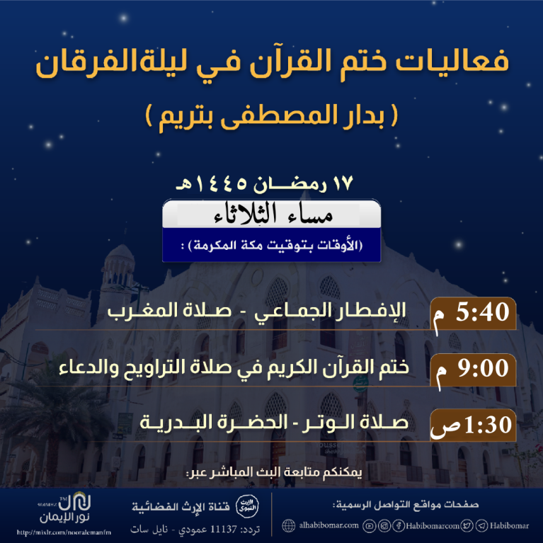 وفي هذه الليلة المباركة، ليلة الأربعاء ١٧ رمضان ١٤٤٥هـ، سيكون ختم القرآن الكريم في صلاة التراويح، إن شاء الله تعالى، وسيكون البرنامج على النحو التالي:
