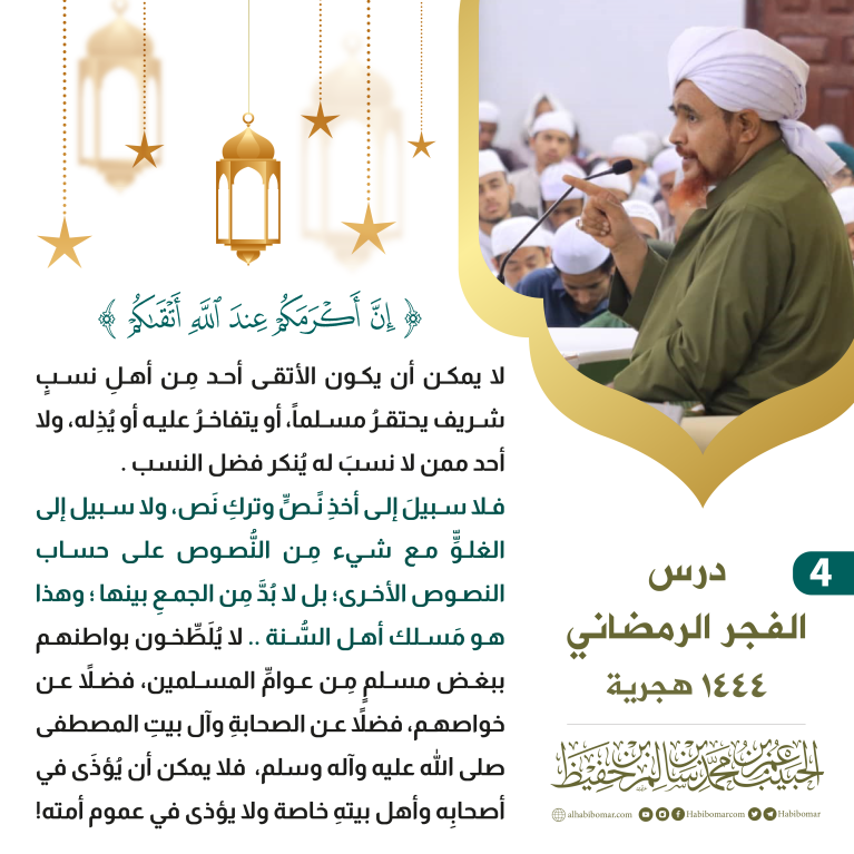 Kemuliaan seseorang sesuai dengan ketakwaannya. Siapa yang paling bertakwa kepada Allah ialah yang paling mulia, oleh sebab itu tidak mungkin menjadi orang yang bertakwa jika salah satu dari orang yang terlahir dari keturunan terhormat yang masih menghina seorang Muslim, atau menyombongkan dirinya atau merendahkannya, dan juga tidak boleh mereka yang terlahir dari keturunan biasa mengingkari kehormatan keturunan nasabnya orang yang terhormat.