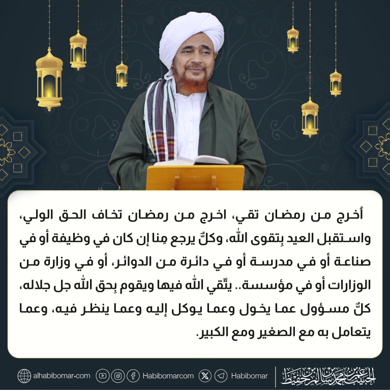 اُخرج من رمضان تقي، اخرج من رمضان تخاف الحق الولي، واستقبل العيد بِتقوى الله، وكلٌّ يرجع مِنا إن كان في وظيفة أو في صناعة أو في مدرسة أو في دائرة من الدوائر، أو في وزارة من الوزارات أو في مؤسسة.. يتّقي الله فيها ويقوم بِحق الله جل جلاله، كلٌّ مسؤول عما يخول وعما يوكل إليه وعما ينظر فيه، وعما يتعامل به مع الصغير ومع الكبير.