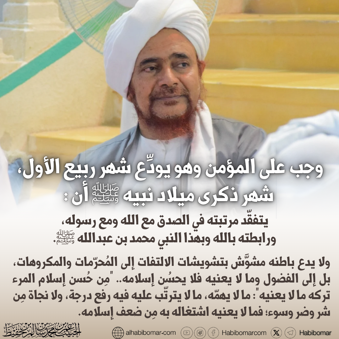 “Seorang mukmin, ketika ia berpamitan dengan bulan Rabi‘ul Awwal —bulan peringatan kelahiran Nabi ﷺ— wajib memeriksa dirinya: sejauh mana kesungguhannya dengan Allah dan Rasul-Nya, serta bagaimana hubungannya dengan Allah dan dengan Nabi Muhammad bin Abdullah ﷺ.