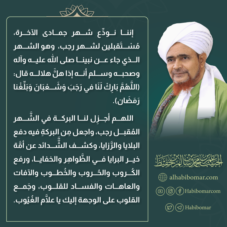 اللهم أجزِل لنا البركة في الشَّهر المُقبل رجب، واجعل مِن البركةِ فيه دفع البلايا والرَّزايا، وكشف الشَّّدائد عن أمَّة خير البرايا في الظَّواهِر والخفايا، ورفع الكُروب والحُروب والخُطوب والآفات والعاهات والفساد للقلوب، وجَمع القلوب على الوجهة إليك يا علَّام الغُيُوب.