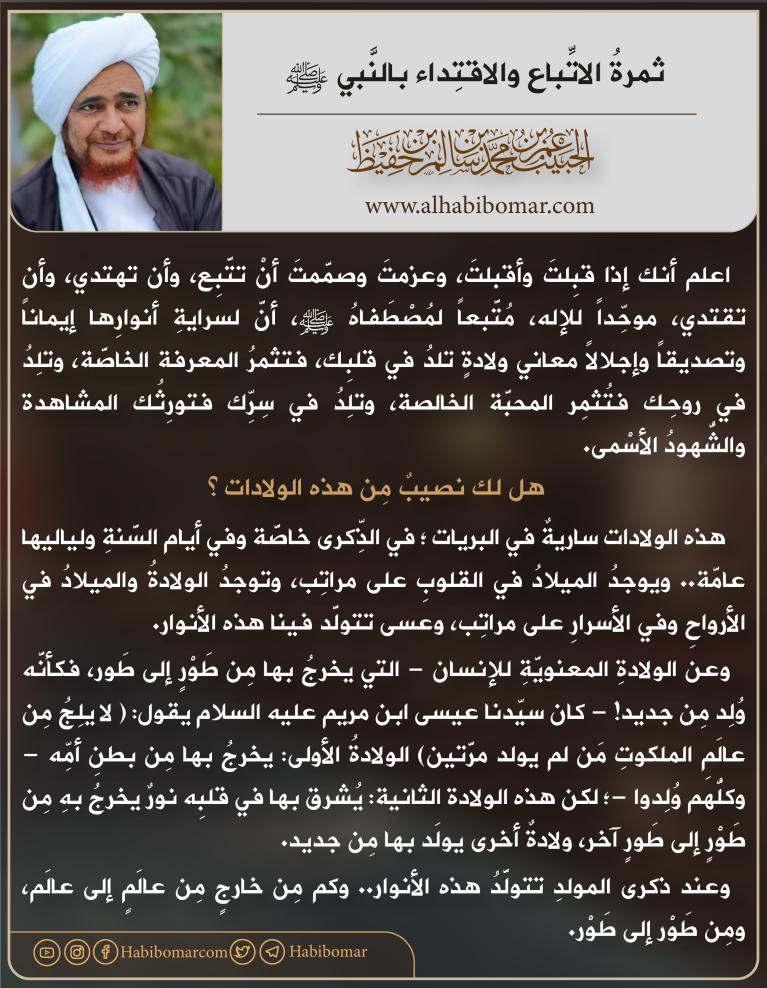 اعلم أنك إذا قبلتَ وأقبلت، وعزمت وصممتَ أنْ تتبع، وأن تهتدي، وأن تقتدي، موحّداً للإله، مُتَّبعاً لمُصْطَفاهُ ﷺ، أنّ لِسراية أنوارها إيماناً وتصديقاً وإجلالا معاني ولادة تلدُ في قلبك، فتثمرُ المعرفة الخاصة، وتلد في روحك فتُثمر المحبة الخالصة، وتلدُ في سرك فتورثُك المشاهدة والشهود الأسمى.