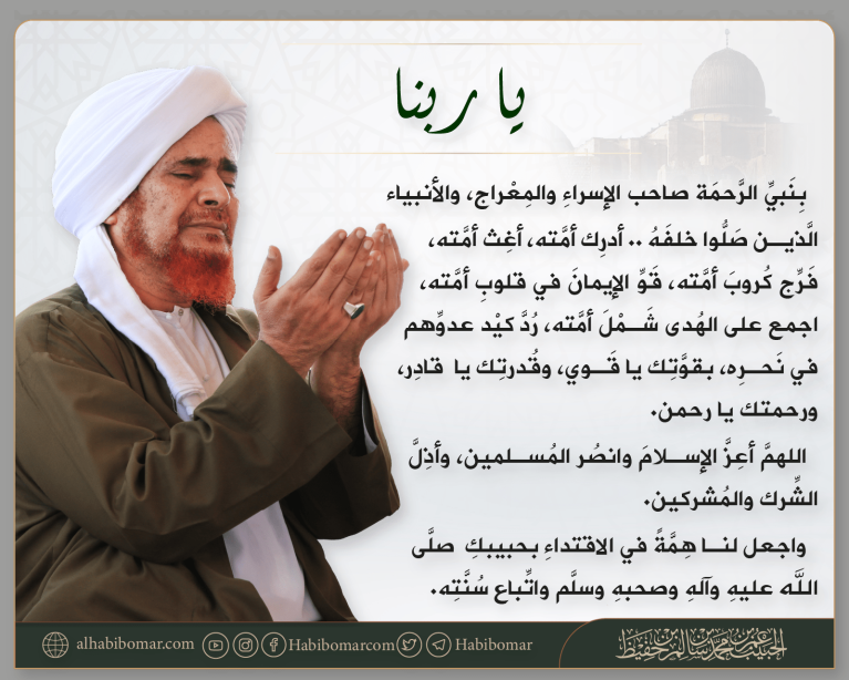يا ربنا بِنَبِيِّ الرَّحمَة صاحب الإسراء والمعراج، والأنبياء الذين صَلُّوا خلفَهُ.. أدرك أمته، أغِث أُمته، فَرِّج كُروبَ أمته، قَوِّ الإيمان في قلوب أمته، اجمع على الهُدى شَمْلَ أمته، رُدَّ كيد عدوهم في نحره، بقوتِك يا قوي، وقدرتك يا قادر، ورحمتك يا رحمن.