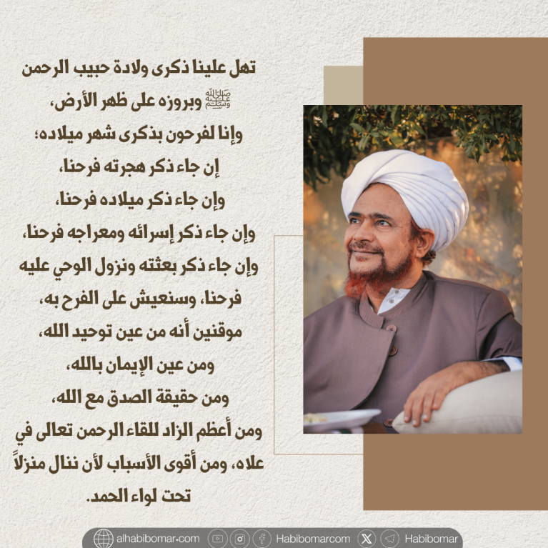 Kita akan segera menyambut peringatan kelahiran Kekasih Allah ﷺ dan kemunculannya di muka bumi ini. Kita sangat berbahagia menyambut bulan kelahirannya; ketika disebutkan hijrahnya, kita berbahagia; ketika disebutkan kelahirannya, kita berbahagia; ketika disebutkan Isra’ dan Mi’rajnya, kita berbahagia; ketika disebutkan pengutusannya dan turunnya wahyu kepadanya, kita berbahagia. Kita akan terus hidup dalam kebahagiaan bersamanya, meyakini bahwa kebahagiaan tersebut adalah bagian dari tauhid kepada Allah, bagian dari iman kepada-Nya, bagian dari ketulusan yang hakiki kepada Allah, merupakan bekal terbaik untuk bertemu dengan Tuhan Yang Maha Pemurah di tempat-Nya yang tinggi, serta menjadi salah satu sebab terkuat untuk memperoleh tempat di bawah panji Al-Hamd.