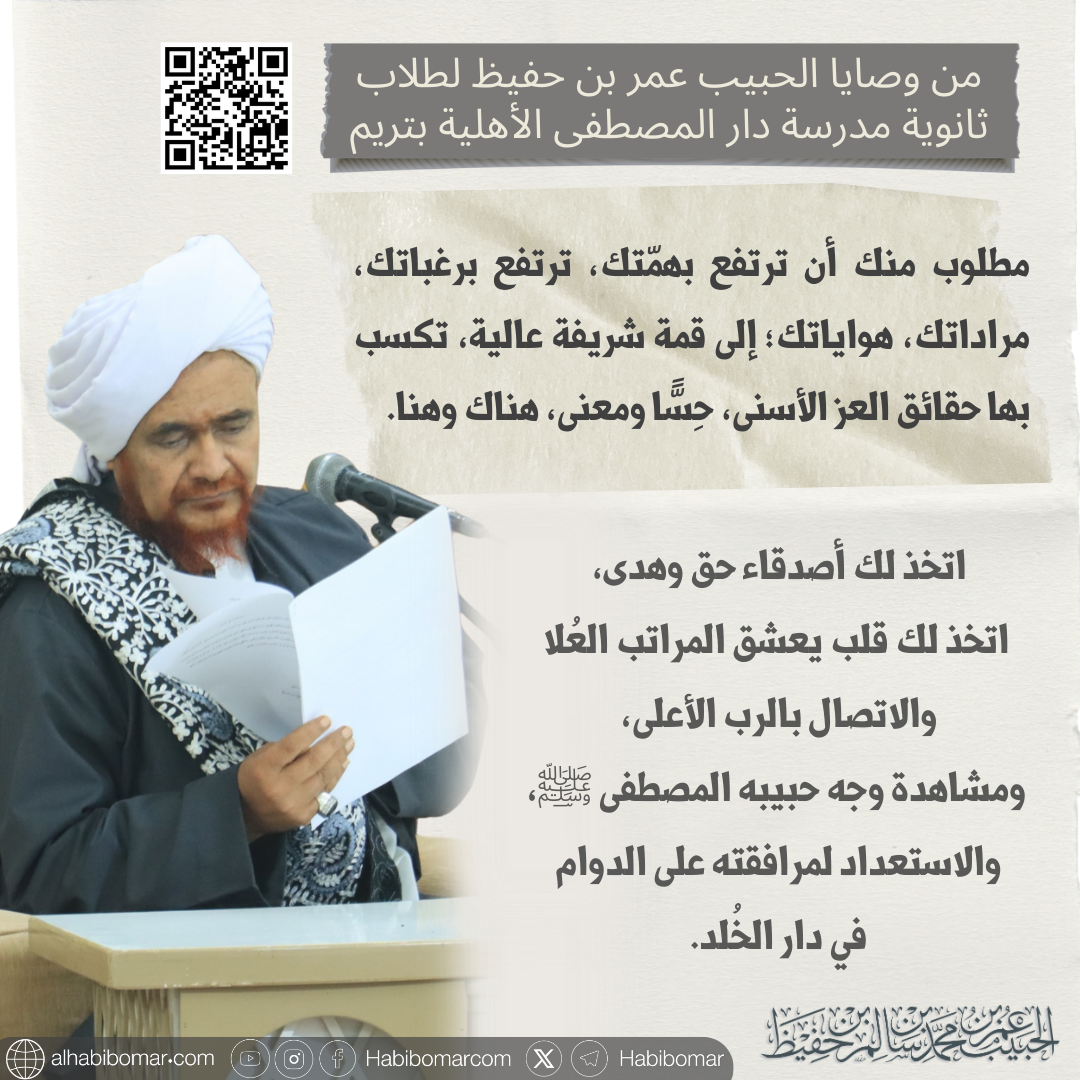 في لقاء مع طلاب ثانوية مدرسة دار المصطفى الأهلية بتريم، ضحى الخميس 6 جمادى الآخرة 1447هـ، يوصي الحبيب عمر بن حفيظ بتوجيهات تربوية هامة: