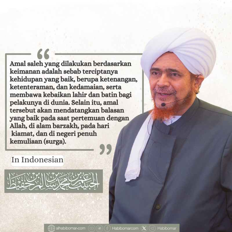 In Indonesian: Amal saleh yang dilakukan berdasarkan keimanan adalah sebab terciptanya kehidupan yang baik, berupa ketenangan, ketenteraman, dan kedamaian, serta membawa kebaikan lahir dan batin bagi pelakunya di dunia. Selain itu, amal tersebut akan mendatangkan balasan yang baik pada saat pertemuan dengan Allah, di alam barzakh, pada hari kiamat, dan di negeri penuh kemuliaan (surga).