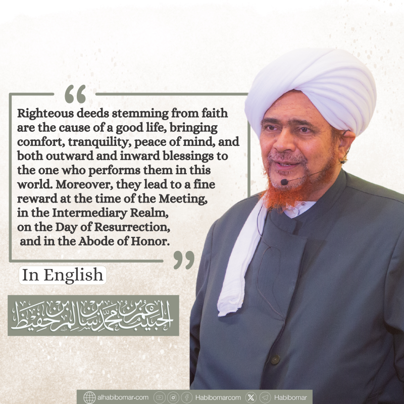 In English: Righteous deeds stemming from faith are the cause of a good life, bringing comfort, tranquility, peace of mind, and both outward and inward blessings to the one who performs them in this world. Moreover, they lead to a fine reward at the time of the Meeting, in the Intermediary Realm, on the Day of Resurrection, and in the Abode of Honor.