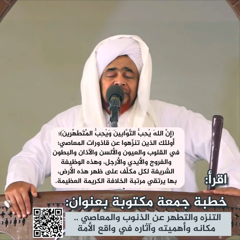 اقرأ: خطبة مكتوبة للعلامة الحبيب عمر بن حفيظ بعنوان: التنزه والتطهر عن الذنوب والمعاصي .. مكانه وأهميته وآثاره في واقع الأمة ومصيرها