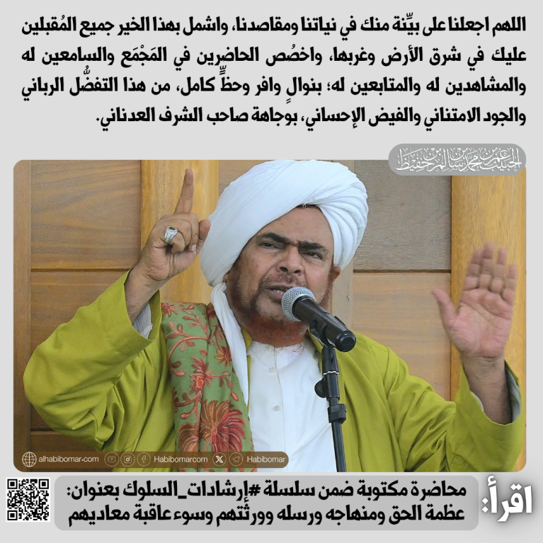 اللهم اجعلنا على بيِّنة منك، في نياتنا ومقاصدنا، واشمل بهذا الخير جميع المُقبلين عليك في شرق الأرض وغربها، واخصُص الحاضرين في المَجْمَع، والسامعين له والمشاهدين له والمتابعين له؛ بنوالٍ وافر وحظٍّ كامل، من هذا التفضُّل الرباني والجود الامتناني والفيض الإحساني، بوجاهة صاحب الشرف العدناني.