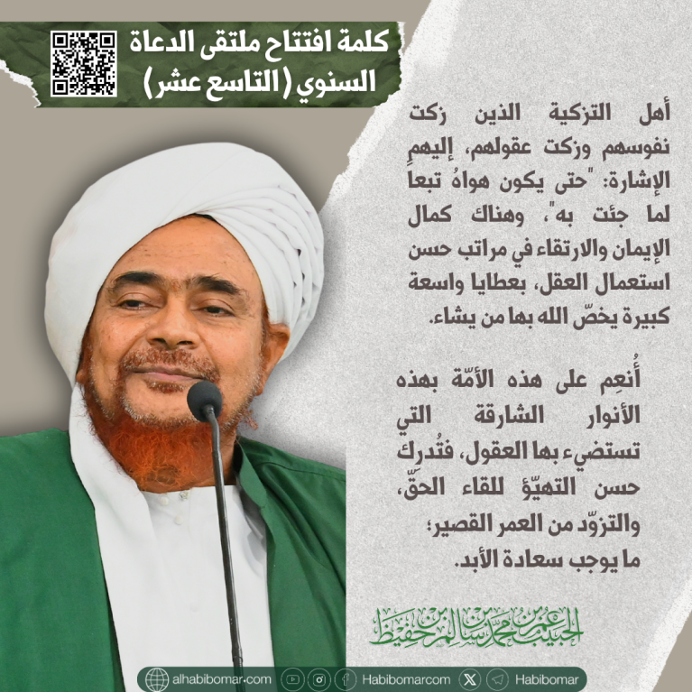 اقرأ: محاضرة مكتوبة للعلامة الحبيب عمر بن حفيظ، في افتتاح ملتقى الدعاة السنوي (19) بعنوان: حقيقة العقل وحُسن استعماله ومهمته في العدل بين الشهوات والغضب والحُكم في المحسوسات الماديّة والغيبيّات المعنوية وأثر كل ذلك على اتجاه ووجهة الافراد والجماعات والشعوب والدول، ليلة الخميس 1 محرم 1447هـ