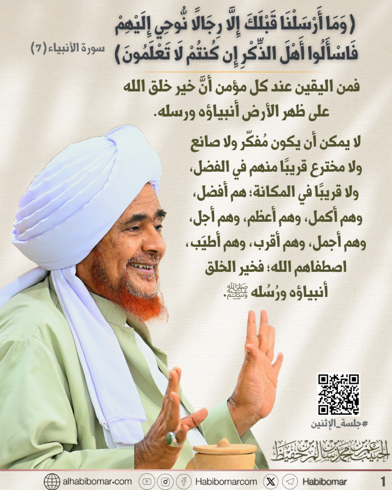 (وَمَا أَرْسَلْنَا قَبْلَكَ إِلَّا رِجَالًا نُّوحِي إِلَيْهِمْ فَاسْأَلُوا أَهْلَ الذِّكْرِ إِن كُنتُمْ لَا تَعْلَمُونَ) فمن اليقين عند كل مؤمن أنَّ خير خلق الله على ظهر الأرض أنبياؤه ورسله، لا يمكن أن يكون مُفكّر ولا صانع ولا مخترع قريبًا منهم في الفضل، ولا قريبًا في المكانة؛ هم أفضل، وهم أكمل، وهم أعظم، وهم أجل، وهم أجمل، وهم أقرب، وهم أطيَب، اصطفاهم الله؛ فخير الخلق أنبياؤه ورُسُله ﷺ.
