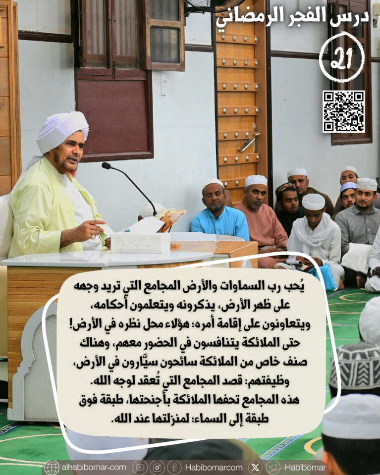 - - حتى الملائكة يتنافسون في الحضور معهم، وهناك صنف خاص من الملائكة سائحون سيَّارون في الأرض، سماهم النبي ﷺ سياحين، وظيفتهم: قصد المجامع التي تُعقد لوجه الله.