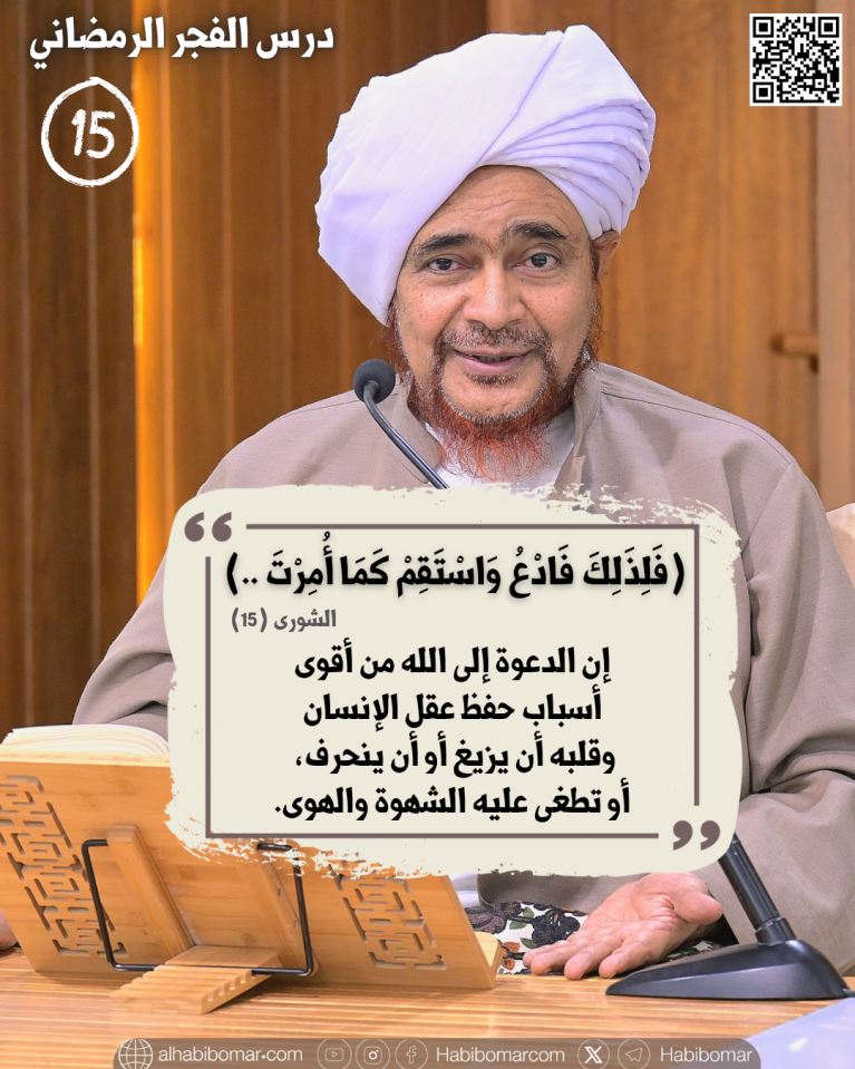 (فَلِذَٰلِكَ فَادْعُ..)؛ إن الدعوة إلى الله من أقوى أسباب حفظ عقل الإنسان وقلبه أن يزيغ أو أن ينحرف، أو تطغى عليه الشهوة والهوى.