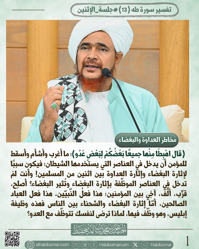 (قال اهْبِطَا مِنْها جميعًا بَعْضُكُمْ لِبَعْضٍ عَدُو)؛ مِن أشد ما تجدون في المكان الذي أنقلكم إليه وأخرجكم من الجنة؛ أن يحصل بين ذريتكم هذا التعادي والتباغُض على غير وجه الحق؛ للأهواء، للأنفس، للشهوات، للمرادات الفانِيات، يتباغضون ويتعادون ويتحاسدون حتى يتقاتلون والعياذ بالله، وحُكم القضية خطير.
