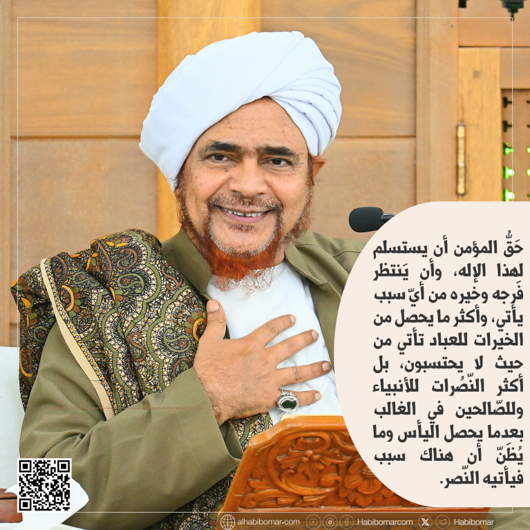 - فحَقُّ المؤمن أن يستسلم لهذا الإله، وأن ينتظر فرجه وخيره من أيّ سبب يأتي، وأكثر ما يحصل من الخيرات للعباد تأتي من حيث لا يحتسبون، بل أكثر النّصُرات للأنبياء وللصالحين في الغالب بعدما يحصل اليأس وما يُظَن أن هناك سبب فيأتيه النصر.