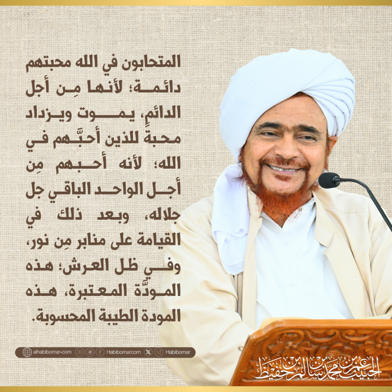 المتحابون في الله محبتهم دائمة؛ لأنها مِن أجل الدائم، يموت ويزداد محبةً للذين أحبَّهم في الله، ويتفرّغ بعد الموت للدعاء لهم أكثر ويذكرهم أكثر؛ لأنه أحبهم مِن أجل الواحد الباقي جل جلاله، وبعد ذلك في القيامة على منابر مِن نور، وفي ظل العرش؛ هذه المودَّة المعتبرة، هذه المودة الطيبة المحسوبة.