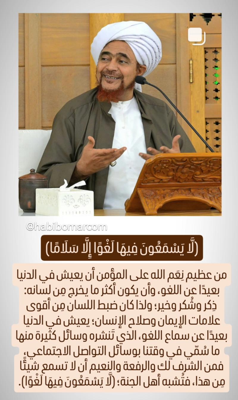 * من عظيم نِعَم الله على المؤمن أن يعيش في الدنيا بعيدًا عن اللغو، وأن يكون أكثر ما يخرج مِن لسانه: ذِكر وشُكر وخير؛ ولذا كان ضبط اللسان مِن أقوى علامات الإيمان وصلاح الإنسان؛ أن يضبط لسانه وألفاظه، يعيش في الدنيا بعيدًا عن سماع اللغو، الذي تَنشره وسائل كثيرة منها ما سُمّي في وقتنا بوسائل التواصل الاجتماعي، وأجهزة تنشر اللغو، فمن الشرف لك والرفعة والنعيم أن لا تسمع شيئًا مِن هذا، فتُشبه أهل الجنة؛ (لَّا يَسْمَعُونَ فِيهَا لَغْوًا).