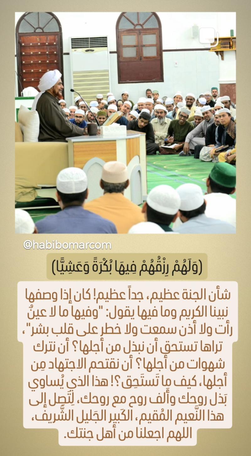 * (وَلَهُمْ رِزْقُهُمْ فِيهَا بُكْرَةً وَعَشِيًّا) فشأن الجنة عظيم، جداً عظيم! كان إذا وصفها نبينا الكريم وما فيها يقف ويقول: "وفيها ما لا عينٌ رأت ولا أذن سمعت ولا خطر على قلب بشر"، فما تراها تستحق أن نبذل من أجلها؟ أن نترك شهوات من أجلها؟ أن نقتحم الاجتهاد مِن أجلها، كيف ما تَستَحِق؟! هذا الذي يُساوي بَذل روحك وأَلف روح مع روحك، لِتَصِل إلى هذا النَّعيم المُقيم، الكَبير الجَليل الشَّريف، اللهم اجعلنا من أهل جنتك.