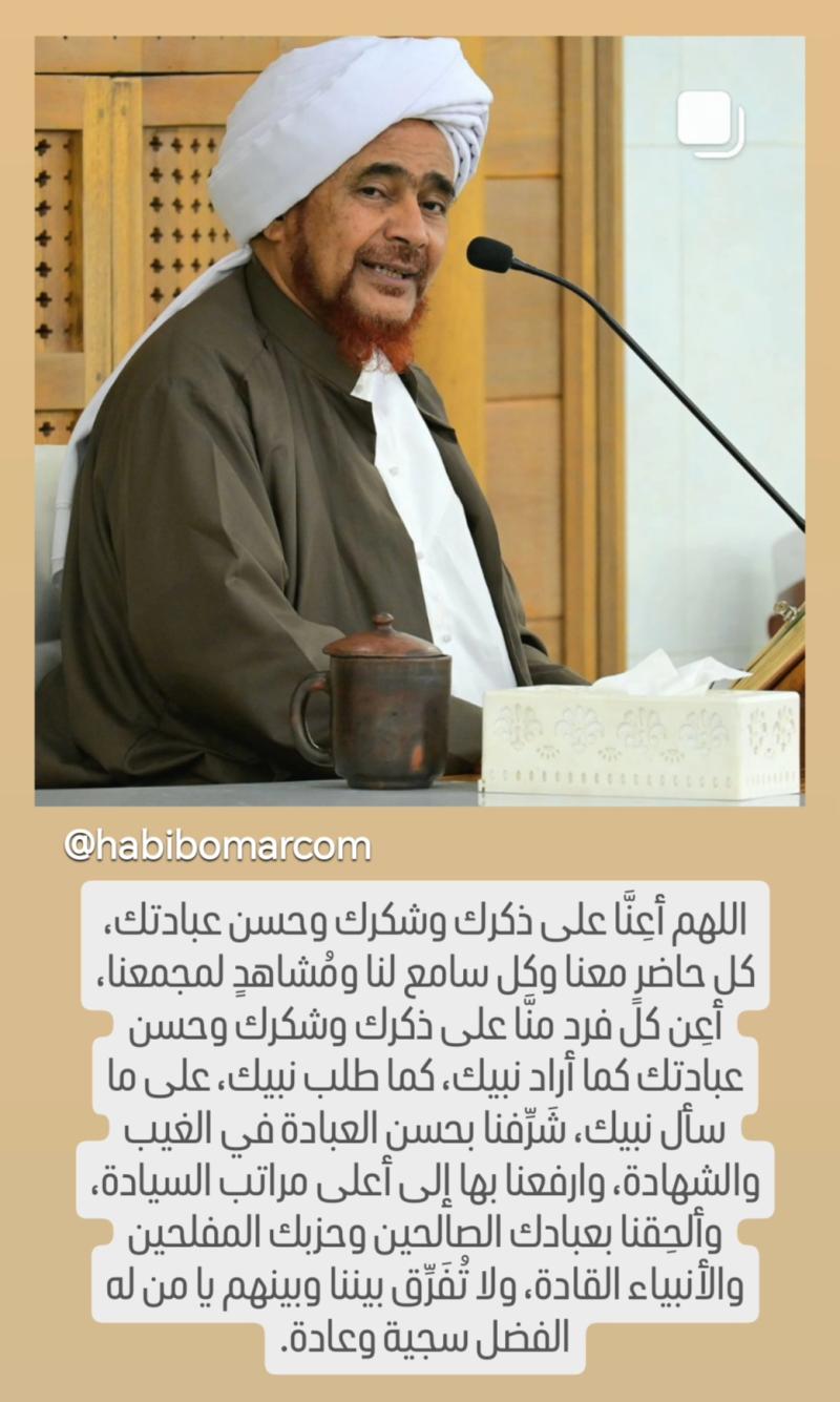 اللهم أعِنَّا على ذكرك وشكرك وحسن عبادتك، كل حاضرٍ معنا وكل سامع لنا ومُشاهدٍ لمجمعنا، أعِن كل فرد منَّا على ذكرك وشكرك وحسن عبادتك كما أراد نبيك، كما طلب نبيك، على ما سأل نبيك، شَرِّفنا بحسن العبادة في الغيب والشهادة، وارفعنا بها إلى أعلى مراتب السيادة، وألحِقنا بعبادك الصالحين وحزبك المفلحين والأنبياء القادة، ولا تُفَرِّق بيننا وبينهم يا من له الفضل سجية وعادة.