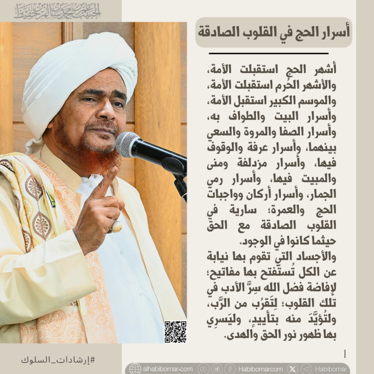 أشهر الحج استقبلت الأمة، والأشهر الحُرم استقبلت الأمة، والموسم الكبير استقبل الأمة، وأسرار البيت والطواف به، وأسرار الصفا والمروة والسعي بينهما، وأسرار عرفة والوقوف فيها، وأسرار مزدلفة ومنى والمبيت فيها، وأسرار رمي الجمار، وأسرار أركان وواجبات الحج والعمرة؛ سارية في القلوب الصادقة مع الحق حيثما كانوا في الوجود.