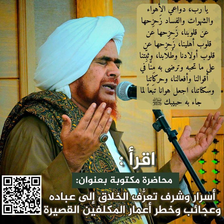 يا الله لا تحرِم قلب مَن حضر معنا ولا من يسمعنا ويُشاهدنا من سِرِّ نور الصدق معك، والإقبال بالكُلِّيّة عليك، وتعرُّفك إليه؛ يا ربنا حتى نَثبُت على قدم الاقتداء والاتِّباع، ونرقى في مراتب الارتفاع، ونغنم فوائد هذا العمر القصير الخطير؛ لنكون في البرازخ مع خَوَاصِّ أهل التنوير، مِمّن قبورهم رياض الجنة وأرواحهم في عِليّين، ونَسعَد في القيامة بالقُربِ مِن المُظَلَّلِ بالغمامة، عند البعث وساعة الوقوف بين يديك، وعند الميزان وعند الحوض وعند الصراط، وفي الجنة في فراديسها، من غير سابقة عذاب ولا عتاب، ولا فتنة ولا حساب.