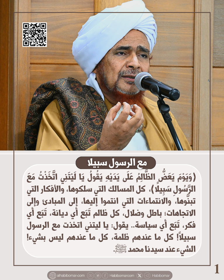 (وَيَوْمَ يَعَضُّ الظَّالِمُ عَلَىٰ يَدَيْهِ يَقُولُ يَا لَيْتَنِي اتَّخَذْتُ مَعَ الرَّسُولِ سَبِيلًا)؛ فكُلُّ المسالك التي سلكوها، والأفكار التي تبنَّوها، والانتماءات التي انتموا إليها، إلى المبادئ وإلى الاتجاهات؛ باطل وضلال، كل ظالم تَبَع أي ديانة، تَبَع أي فكر، تَبَع أي سياسة.. يقول: يا ليتني اتخذت مع الرسول سبيلاً! كل ما عندهم ظلمة، كل ما عندهم ليس بشيء! الشيء عند سيدنا محمد ﷺ.