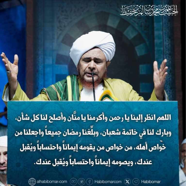 اللهم انظر إلينا يا رحمن وأكرمنا يا منَّان وأصلح لنا كل شأن، وبارك لنا في خاتمة شعبان، وبلِّغنا رمضان جميعاً واجعلنا من خواص أهله، من خواص من يقومه إيماناً واحتساباً ويُقبل عندك، ويصومه إيماناً واحتساباً ويُقبل عندك.
