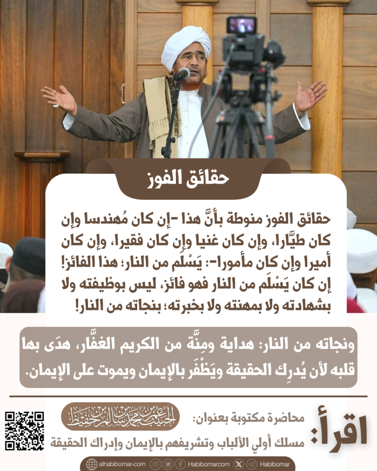 حقائق الفوز منوطة بأنَّ هذا -إن كان مُهندسا وإن كان طيَّارا، وإن كان غنيا وإن كان فقيرا، وإن كان أميرا وإن كان مأمورا-: يَسْلَم من النار؛ هذا الفائز! إن كان يَسْلَم من النار فهو فائز، ليس بوظيفته ولا بشهادته ولا بمهنته ولا بخبرته؛ بنجاته من النار!