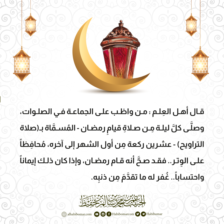قال أهل العِلم : من واظب على الجماعة في الصلوات، وصلَّى كلَّ ليلة مِن صلاةِ قيامِ رمضان - المُسمَّاة بـ(صلاة التراويح) - عشرين ركعة مِن أول الشهر إلى آخره، مُحافِظاً على الوِتر.. فقد صحَّ أنه قام رمضان، وإذا كان ذلك إيماناً واحتساباً.. غُفر له ما تقدَّمَ مِن ذنبِه.