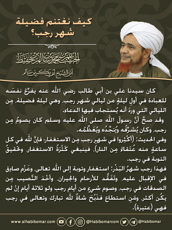 وقد صحَّ أنَّ رسولَ الله صلى الله عليه وسلم كان يصومُ مِن رجب، وكان يُشرِّفُه ويُمَجِّدُه ويُعَظِّمُه، في ما رواه أبو الحسن علي بن محمد الربعي بسندٍ رجالُه ثقات أنَّ عُرْوةَ سأل سيدَنا عبدَالله بن عمر رضي الله عنهما: أكانَ رسولُ الله صلى الله عليه وسلم يصومُ رجب؟ قال: نعم، ويُشَرِّفُه، يصوم في شهر رجب ويُشَرِّف هذا الشهرَ الكريم، وسمَّاهُ: الفرْدَ مِن بين الأشْهُر الحُرم، وفي الحديث: (أكْثِروا في شهرِ رجب مِن الاستغفار؛ فإنَّ لله في كل ساعةٍ منه عُتَقاءَ مِن النار)، اللهم اجعلنا مِن خواص أهله، اللهم بارك لنا في رجب وشعبان وبلِّغنا رمضان، وأعِنَّا على الصيام والقيام.