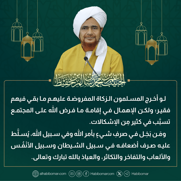 لو أخرج المسلمون الزكاة المفروضة عليهم.. ما بقي فيهم فقير، ولكن الإهمال في إقامة ما فرض الله على المجتمع.. تسبب في كثير من الإشكالات، ومن بخل في صرف شيء بأمر الله وفي سبيل الله.. يسلط عليه صرف أضعافه في سبيل الشيطان وسبيل الأنفس والألعاب والتفاخر والتكاثر والعياذ بالله تبارك وتعالى.