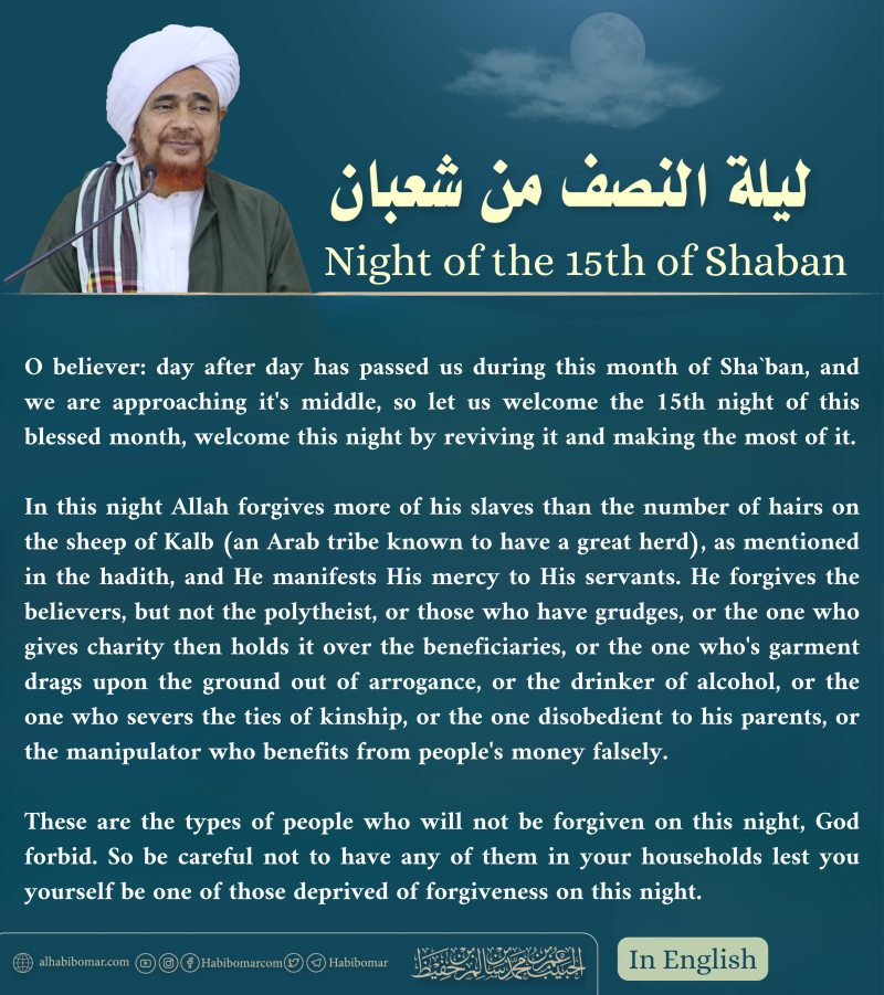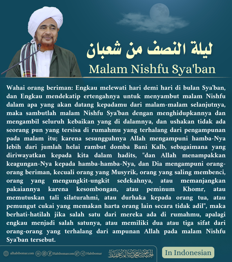 Wahai orang beriman: Engkau melewati hari demi hari di bulan Sya'ban, dan Engkau mendekatip ertengahnya untuk menyambut malam Nishfu dalam apa yang akan datang kepadamu dari malam-malam selanjutnya, maka sambutlah malam Nishfu Sya'ban dengan menghidupkannya dan mengambil seluruh kebaikan yang di dalamnya, dan ushakan tidak ada seorang pun yang tersisa di rumahmu yang terhalang dari pengampunan pada malam itu; karena sesungguhnya Allah mengampuni hamba-Nya lebih dari jumlah helai rambut domba Bani Kalb, sebagaimana yang diriwayatkan kepada kita dalam hadits, "dan Allah menampakkan keagungan-Nya kepada hamba-hamba-Nya, dan Dia mengampuni orang-orang beriman, kecuali orang yang Musyrik, orang yang saling membenci, orang yang mengungkit-ungkit sedekahnya, atau memanjangkan pakaiannya karena kesombongan, atau peminum Khomr, atau memutuskan tali silaturahmi, atau durhaka kepada orang tua, atau pemungut cukai yang memakan harta orang lain secara tidak adil", maka berhati-hatilah jika salah satu dari mereka ada di rumahmu, apalagi engkau menjadi salah satunya, atau memiliki dua atau tiga sifat dari orang-orang yang terhalang dari ampunan Allah pada malam Nishfu Sya'ban tersebut.