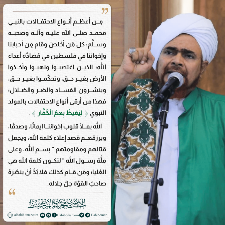 مِن أعظم أنواع الاحتفالات بالنبي محمد صلى الله عليه وآله وصحبه وسلَّم: كل مَن أخْلصَ وقام مِن أحبابنا وإخواننا في فلسطين في مُضادَّة أعداء الله؛ الذين اغتصبوا ونهبوا وأخذوا الأرض بغير حق، وتحكَّموا بغير حق، وينشرون الفساد والضر والضلال؛ فهذا من أرقى أنواع الاحتفالات بالمولد النبوي { لِيَغِيظَ بِهِمُ الْكُفَّار }.