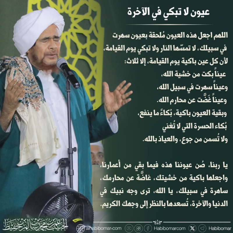 يا ربنا، صُن عيوننا هذه فيما بقي من أعمارنا، واجعلها باكية من خشيتك، غاضَّة عن محارمك، ساهرة في سبيلك، يا الله، يا الله، ترى وجه نبيك في الدنيا والآخرة، تُسعدها بالنظر إلى وجهك الكريم.