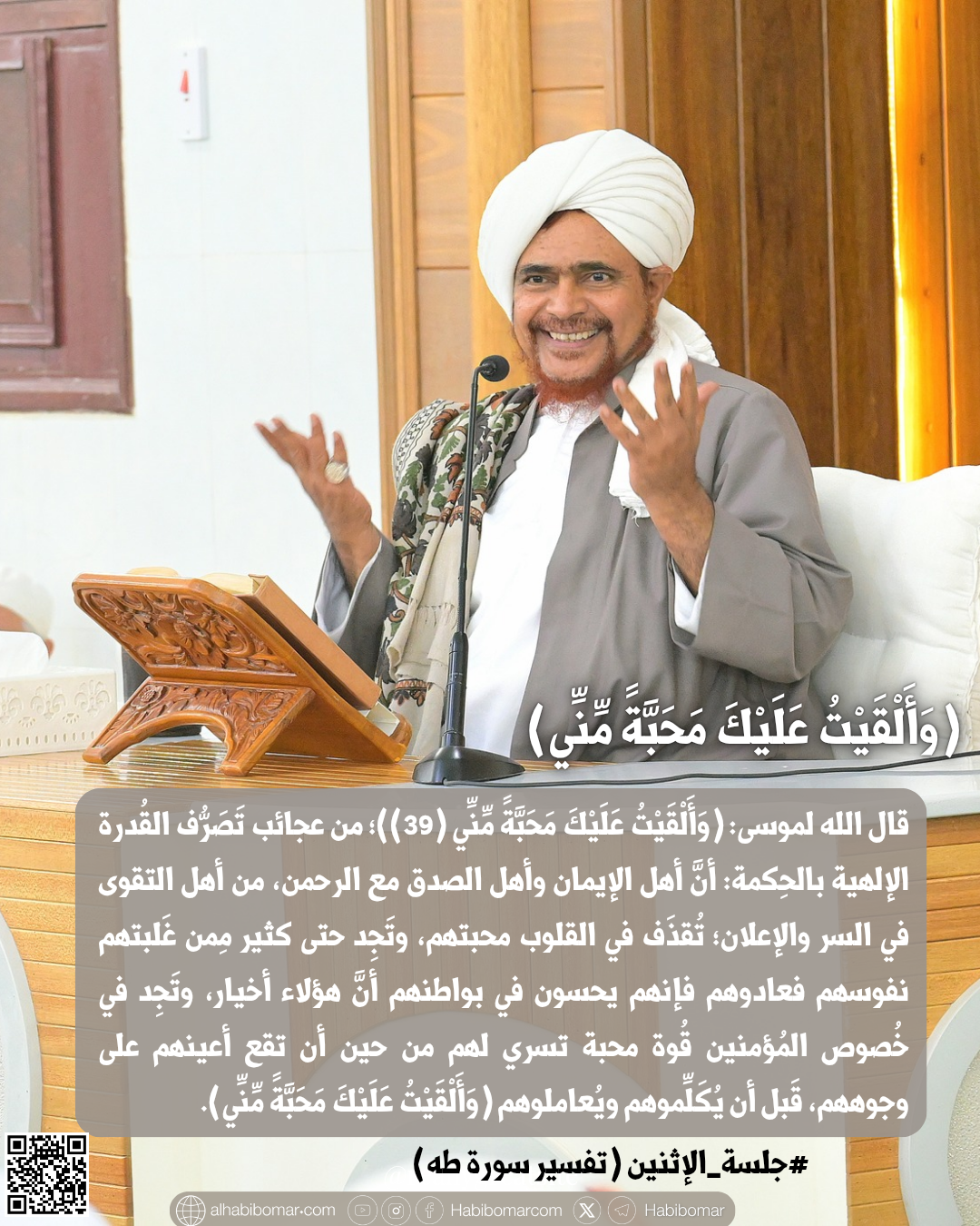 قال الله لموسى: (وَأَلْقَيْتُ عَلَيْكَ مَحَبَّةً مِّنِّي ..(39)) وهذا أيضًا من عجائب تَصَرُّف القُدرة الإلهية بالحِكمة؛ أنَّ أهل الإيمان وأهل الصدق مع الرحمن من أهل التقوى في السر والإعلان تُقذَف في القلوب محبتهم، وتَجِد حتى كثير ممن غَلبتهم نفوسهم فعادوهم أو سَبوهم فإنهم يحسون في بواطنهم أنَّ هؤلاء أخيار، وتَجِد في خُصوص المُؤمنين قُوة محبة تسري لهم من حين ما يَسمعون بهم، ومن حين أن تَقَع أعينهم على وجوهِهِم قَبل أن يُكَلِّموهم ولا أن يُعامِلوهم (وَأَلْقَيْتُ عَلَيْكَ مَحَبَّةً مِّنِّي)، ويقول ﷺ: "إِنَّ اللَّهَ إِذَا أَحَبَّ عَبْدًا نَادَى جِبْرِيلَ، يا جبريل إِنِّي أُحِبُّ فُلَانًا ابن فلان" انظر إلى فلان ذاك الآدمي على ظَهر الأرض، أنا أُحِبه "فأحِبَّه" أي: تَقَرَّب إلي بِحُبِّه واعبُدني بِحُبِّه، قال: "ثم يَأمُر جبريل أن ينادي في أهل السماء: يا أهل السماء إِنَّ اللَّهَ قَدْ أَحَبَّ فُلَانًا ابن فلان فَأَحِبُّوهُ"، قال: "فَيُحِبُّهُ أَهْلُ السَّمَاءِ وَيُوضَعُ لَهُ الْقَبُولُ فِي الْأَرْضِ".