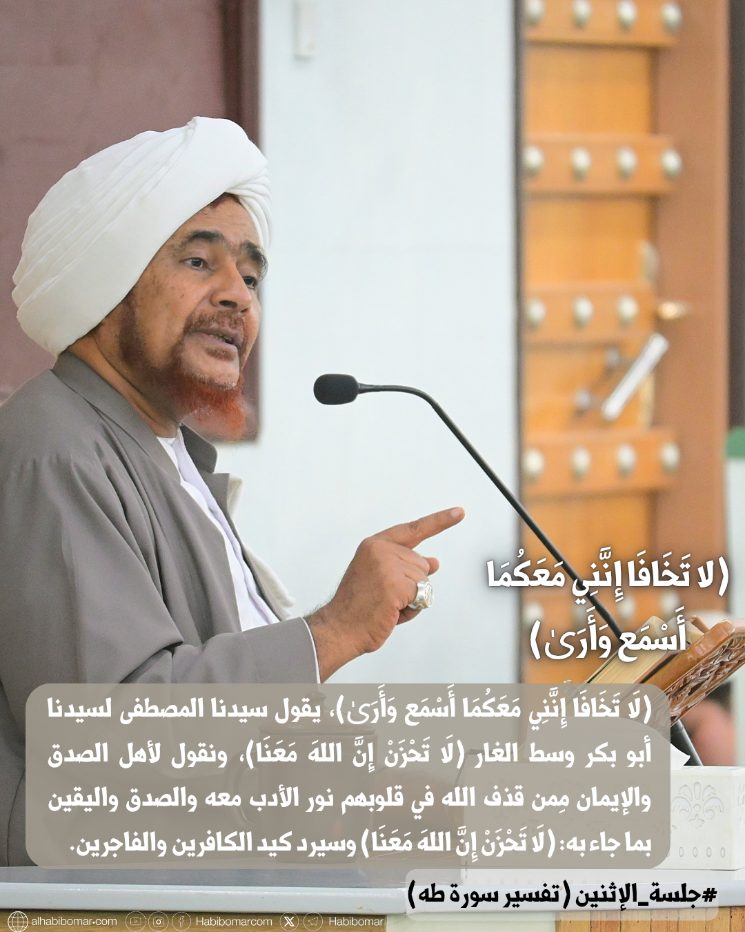 قال: (لَا تَخَافَا إِنَّنِي مَعَكُمَا أَسْمَعُ وَأَرَىٰ (46)) -الله أكبر- (لَا تَخَافَا إِنَّنِي مَعَكُمَا أَسْمَعُ وَأَرَىٰ) يقول سيدنا المصطفى لسيدنا أبو بكر وسط الغار (لَا تَحْزَنْ إِنَّ اللَّهَ مَعَنَا) [التوبة:40] -الله أكبر-، ونقول لأهل الصدق والإيمان ممن قذف الله في قلوبهم نور الأدب معه والصدق واليقين بما جاء به (لَا تَحْزَنْ إِنَّ اللَّهَ مَعَنَا) وسيرد كيد الكافرين والفاجرين.