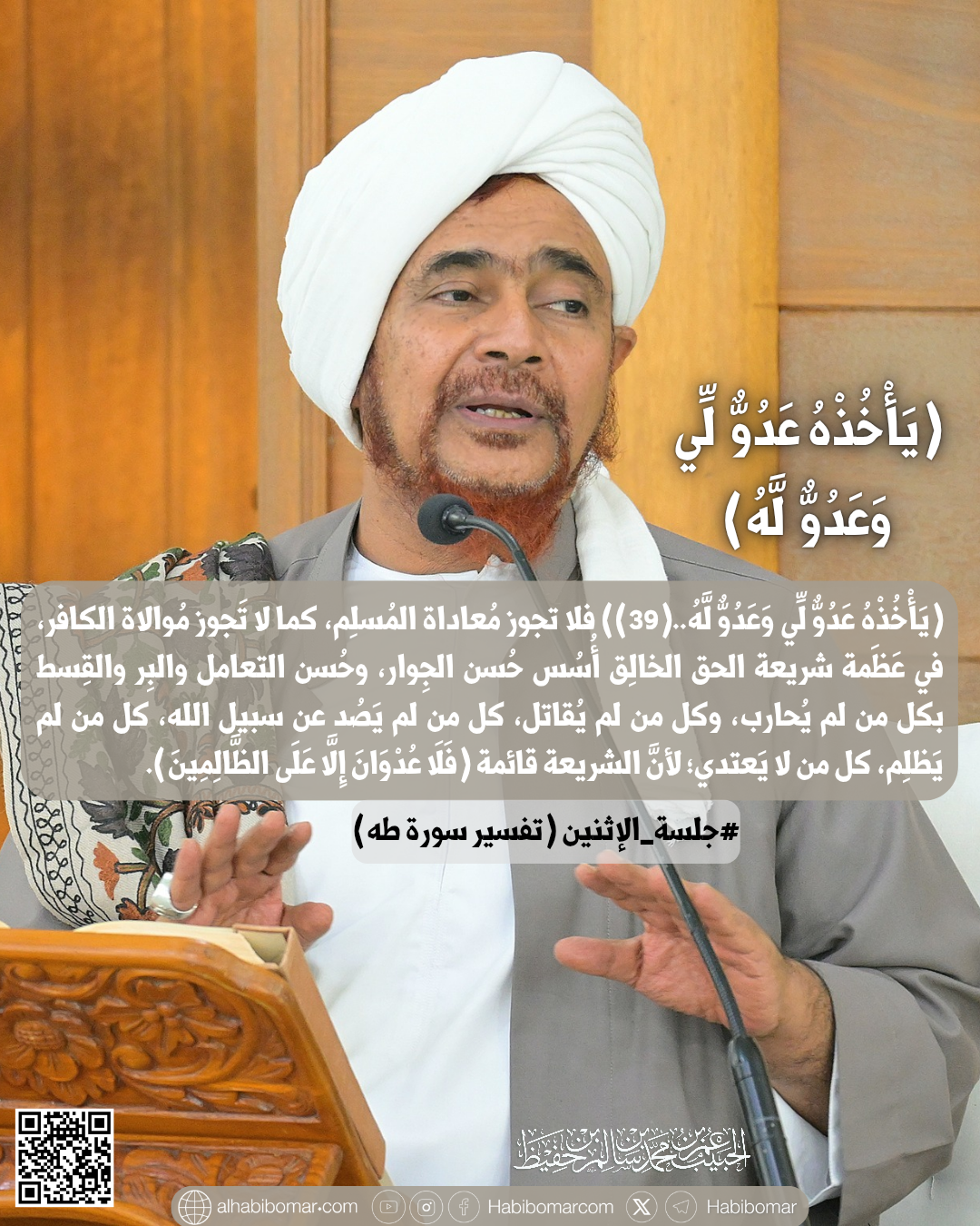 يقول: (يَأْخُذْهُ عَدُوٌّ لِّي وَعَدُوٌّ لَّهُ ..(39)) إذًا فلا تجوز مُعاداة المُسلِم، كما لا تَجوز مُوالاة الكافر، في عَظَمِة شَريعة الحَق الخالِق أُسُس حُسن الجِوار وحُسن التعامل والبِر والقِسط بكل من لم يُحارب، وكل من لم يُقاتل، كل من لم يَصُد عن سبيل الله، كل من لم يَظلِم، كل من لا يَعتدي، لأنَّ الشريعة قائمة (فَلَا عُدْوَانَ إِلَّا عَلَى الظَّالِمِينَ) [البقرة:193]، (لَّا يَنْهَاكُمُ اللَّهُ عَنِ الَّذِينَ لَمْ يُقَاتِلُوكُمْ فِي الدِّينِ وَلَمْ يُخْرِجُوكُم مِّن دِيَارِكُمْ أَن تَبَرُّوهُمْ وَتُقْسِطُوا إِلَيْهِمْ) [الممتحنة:8] (فَإِنِ اعْتَزَلُوكُمْ فَلَمْ يُقَاتِلُوكُمْ وَأَلْقَوْا إِلَيْكُمُ السَّلَمَ فَمَا جَعَلَ اللَّهُ لَكُمْ عَلَيْهِمْ سَبِيلًا) [النساء:90]؛ لكن هل يُريدون أن يَعتَدوا ويَغصِبوا ويَظلِموا ويَنتَهِكوا الحقوق، ويقولون لا أحد يَتَحَرَّك، لا أحد يَمَسّنا، عجيب والله! كيف هل هذا تصرُّف يدل على عَقل؟ هل يَرجِع إلى فِطرة سليمة؟ أم يرجع إلى ماذا؟ دَعونا نَظلِم كما شِئنا وأنتم إذا أحد تحرك منكم فهو غلطان!، ولكن نحن نعمل الذي نريد، أهذا منطق هذا؟! أهذا عَقل هذا؟! مَن يَقبَلُه؟!