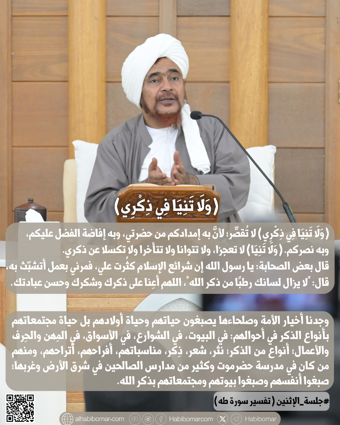 قال: (وَلَا تَنِيَا فِي ذِكْرِي) لا تُقصِّر؛ لأنَّ به إمدادكم من حضرتي، وبه إفاضة الفضل عليكم، وبه نصركم (وَلَا تَنِيَا) لا تعجزا، ولا تتوانا ولا تتأخرا ولا تكسلا عن ذكري، (وَلَا تَنِيَا فِي ذِكْرِي (42)) ما تُقصرّان فيه.