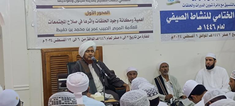 محاضرة العلامة الحبيب عمر بن محمد بن حفيظ في افتتاح برنامج تأهيل معلمي حلقات التعليم السادس بسيئون، في دار الابتهاج بمدينة سيئون، ليلة الأربعاء 4 صفر الخير 1446هـ بعنوان: