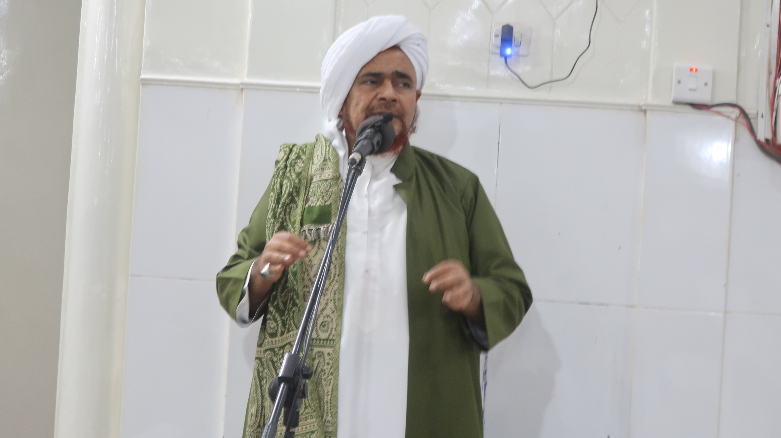 تحت نورانية ميزان الله مجّدتم هذا العلم، وبحمد الله قامت النعم عليكم في هذا المكان وهذا المسجد، كما سمعتم، مرتبط بنورانية عن نورانية إلى "لا إله إلا الله محمد رسول الله"، وإلى أفضل من نطق بها من الخلق وقالها وهو النبي محمد ﷺ.