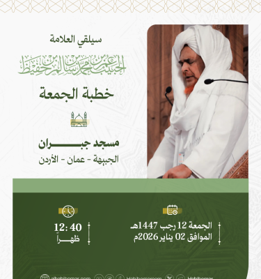 إعلان.. سيلقي العلامة الحبيب عمر بن محمد بن حفيظ خطبة الجمعة بمشيئة الله تعالى .. في مسجد جبران، في العاصمة الأردنية عمّان حوالي الساعة: 12:40 بتوقيت مكة المكرمة الجمعة 13 رجب الأصب 1447هـ ____ موقع...