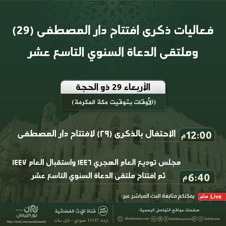 يشهد دار المصطفى بتريم للدراسات الإسلامية، ظهر يوم الأربعاء 29 ذو الحجة 1446هـ الاحتفال بالذكرى التاسعة والعشرين لافتتاحه، بحضور العلماء والأعيان والوافدين من عدد من الدول، وجمع كبير من محبي العلم الشريف.