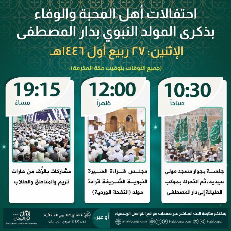 مشاركة للمسلمين في أنحاء العالم في الاحتفال بذكرى المولد النبوي الشريف على صاحبها أفضل الصلاة والسلام تقام بدار المصطفى بتريم في يوم الإثنين ٢٧ ربيع الأول ١٤٤٦هـ الموافق ٣٠ سبتمبر ٢٠٢٤م الاحتفال السنوي بهذه الذكرى الغالية، ويتضمن عدة فعاليات: