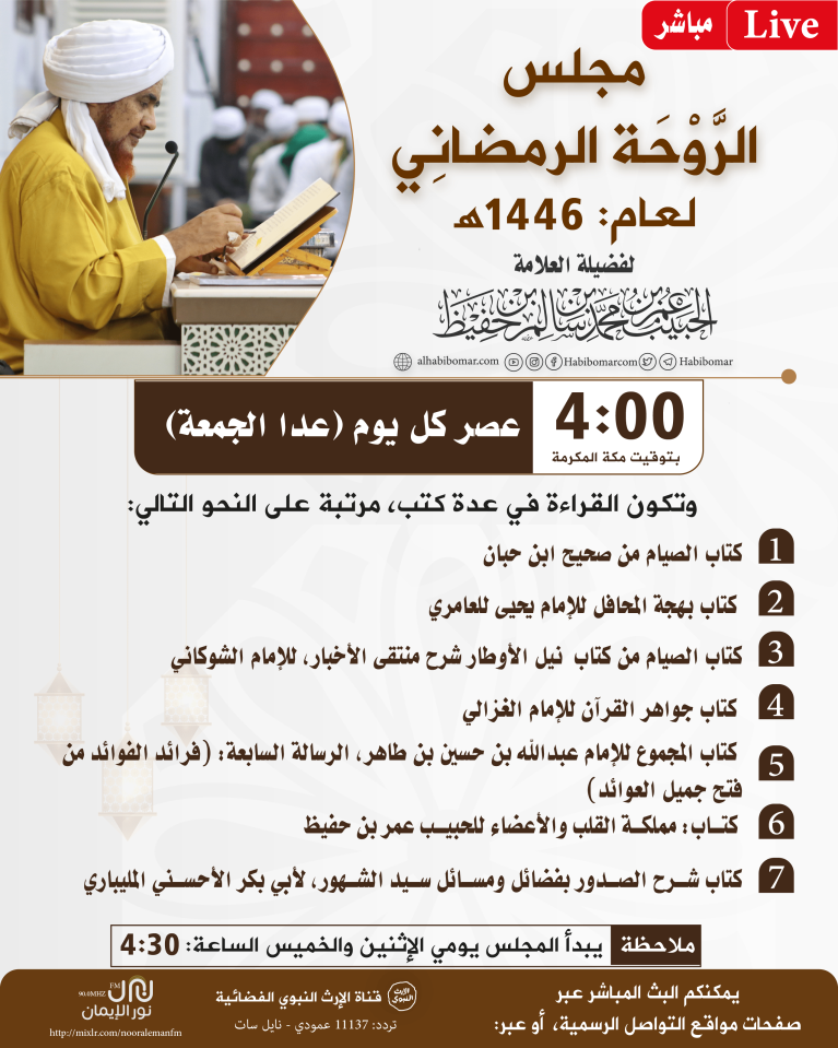 نهنئكم بقدوم شهر رمضان المبارك، ونقدم لكم قائمة دروس العلامة الحبيب عمر بن حفيظ في شهر رمضان لهذا العام 1446هـ، وهي: