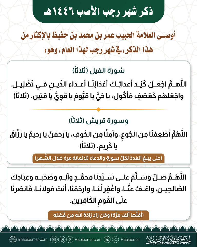 أوصى العلامة الحبيب عمر بن محمد بن حفيظ بالإكثار من هذا الذكر، في شهر رجب لهذا العام 1446هـ، وهو: